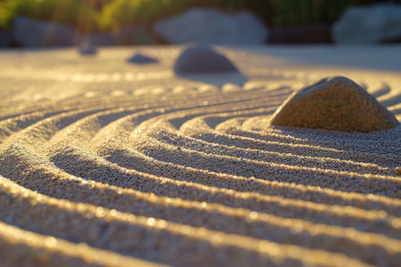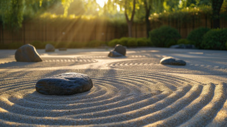 Warm sunlight basks a zen garden highlighting sand patterns and stones
