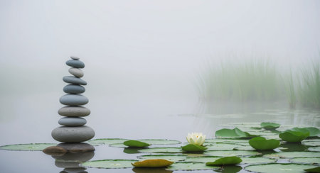 AI Generated. Stacked Stones on Water Lily Pads in a Foggy Pond