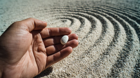 Hand holding a small white pebble against a backdrop of raked sand in a minimalist zen setting