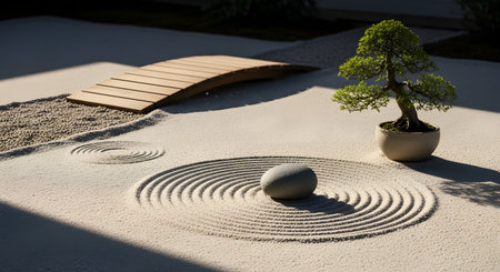 A peaceful Japanese Zen garden featuring raked sand in concentric circles around a smooth stone, a small wooden bridge, and a green bonsai tree. The composition evokes tranquility, mindfulness, and spiritual harmony.