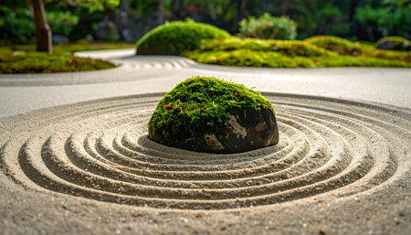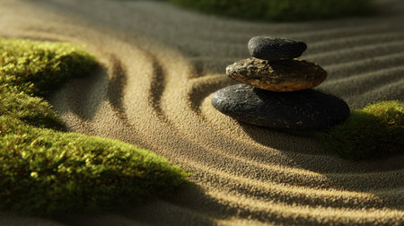 A captivating view of a serene zen garden featuring balanced stones on soft sand, surrounded by lush moss, evoking a sense of peace, tranquility, and natural beauty.