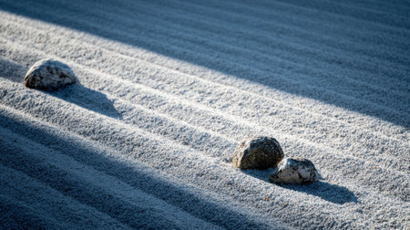 A peaceful Zen garden scene featuring carefully placed stones on raked gravel. Soft light and gentle shadows create a harmonious and tranquil atmosphere ideal for meditation.