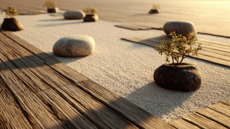 A calming landscape featuring smooth stones and small plants set in soft sand, complemented by weathered wooden planks and bathed in warm golden light.