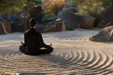 Man meditating on the sand in Japanese zen garden