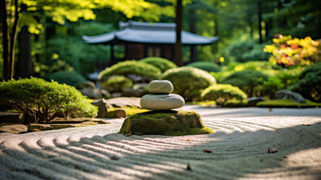 Zen stone stack in harmony with raked sand patterns and surrounding lush shrubs in a serene garden