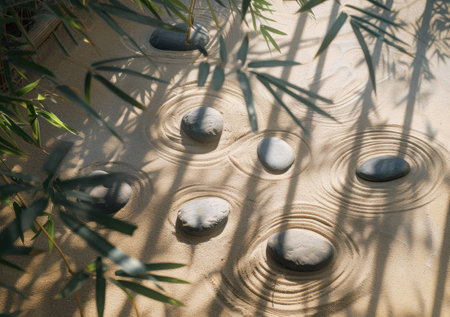 Tranquil Zen garden with smooth stones surrounded by calming ripples in the sand and bamboo leaves casting gentle shadows. Serenity and relaxation concept.