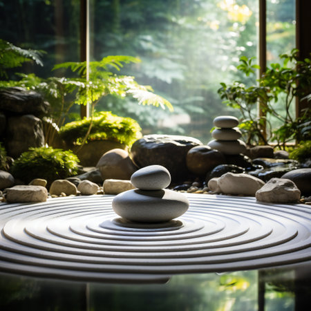 A serene zen garden featuring stacked stones in a calming arrangement, surrounded by raked sand creating a peaceful atmosphere ideal for meditation and relaxation.