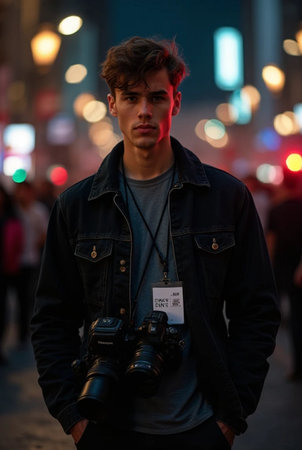 Trendy young hipster man taking picture, enjoying nightlife in the city.