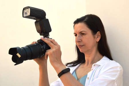 Woman with camera outdoors. Girl takes pictures. Hobby, leisure or profession