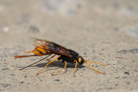 Closeup of a giant woodwasp (Uroceras gigas) resting on the ground, sunny day in summer in the Austrian alps