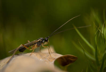 Closeup of an Ichneumon wasp (Callajoppa cirrogaster) resting on a plate