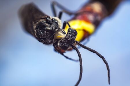 Great wasp wasp of black-orange color standing on the bark of a tree.