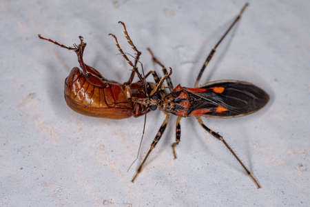 Adult Assassin Bug of the Family Reduviidae preying on a scarab