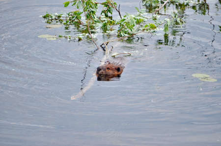 Beaver swimming with tree branch