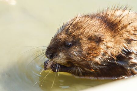 muskrat swimming in the lake close up