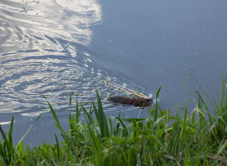 Ondatra zibethicus. Muskrat drags a bunch of grass in his teeth