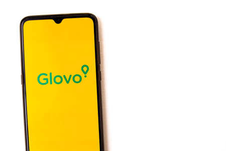 Barcelona, Spain - 20 april 2021: a mobile phone laying white background with Glovo application open. Glovo is a popular food delivery app