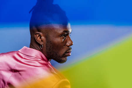 Side view of african american man looking away on colorful background