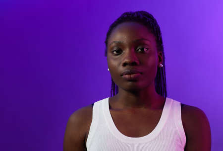 Portrait of young African-American woman looking at camera while standing against purple background in studio, copy space