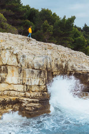 woman in yellow raincoat at the cliff stormy sea water with big waves below. copy space