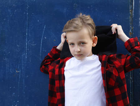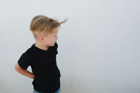 Portrait of a blonde boy casual style, fashionable haircut