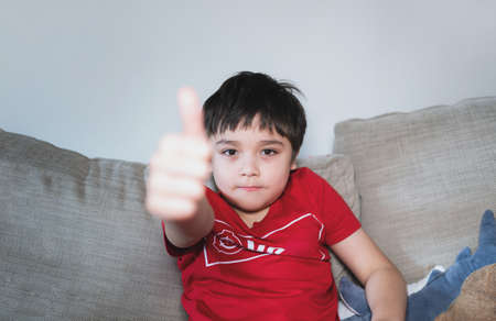 Young happy cheerful Child boy with red T- Shirt showing thumb up, School kid showing OK sign and looking at Camera, Selective focus on face.