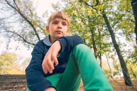 Portrait of a boy looking at the camera, autumn park on a warm sunny day. Happy childhood lifestyle concept