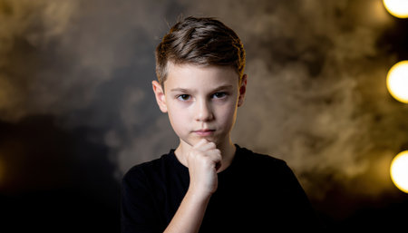 Close up portrait of a preteen male with dark hair wearing a simple black pullover shirt, highlighted by directional light against a textured charcoal background.
