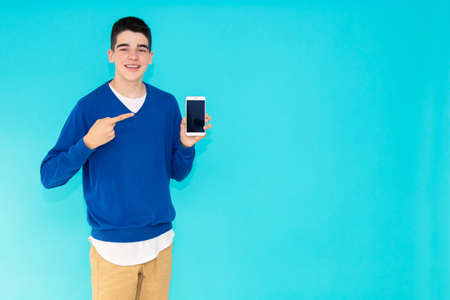 portrait of young teenage man isolated on blue background pointing out