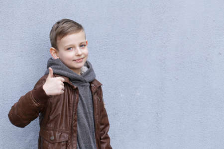 Cute blond boy posing on gray background