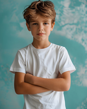 Young male adolescent with curly hair wearing a blue t-shirt, standing against a soft blue background, conveying a sense of calmness and introspection in a minimalist setting