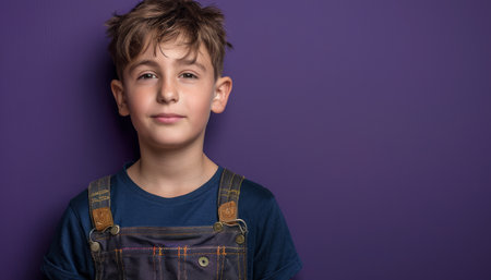 A young boy with brown hair and blue eyes looks directly at the camera with a neutral expression He is wearing a blue t-shirt and denim overalls The background is a solid purple This photo is perfect for a variety of uses, including websites, social media, and print materials AI Generative