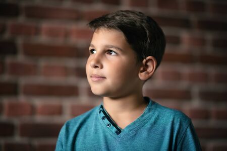 A portrait of a dreamy young boy over the brick wall. Beauty, summer, fashion.