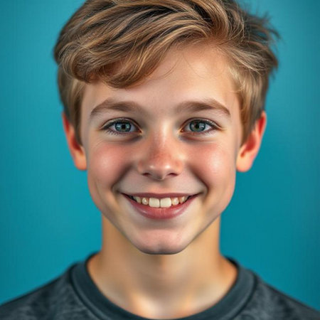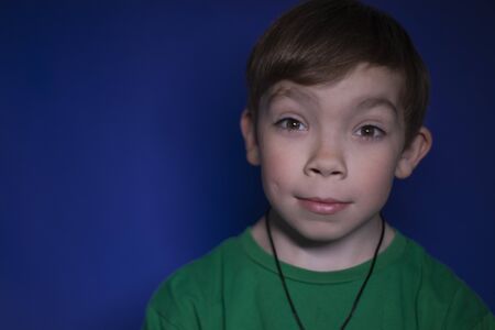 Portrait of a smiling boy with blue eyes on a blue background