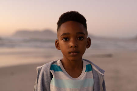 Portrait of african american cute boy wearing jacket standing at beach against clear sky at sunset. copy space, childhood, nature, unaltered, beach, lifestyle, enjoyment and holiday concept.