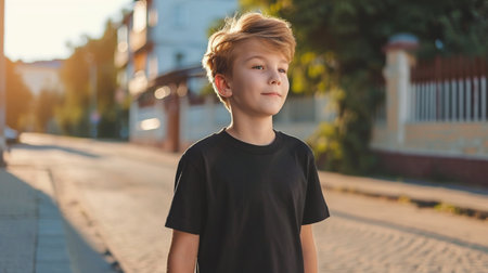 Young Model Shirt Mockup, Boy wearing black t-shirt on street in daylight