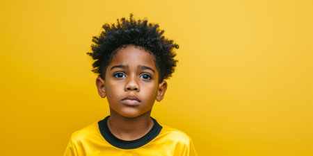 a Black boy in a yellow football jersey, looking determined on a yellow studio background