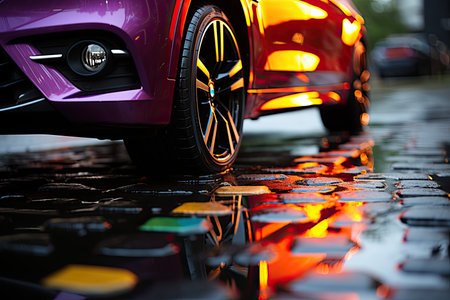 Rainbow colors reflected on the surface of a car tire. A mesmerizing display of color and light, adding a unique touch to automotive photography, Generative AI.