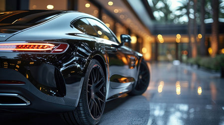 Close-up of a sleek black sports car's rear and wheels, in showroom lighting. Modern, glossy, and luxury car concept.