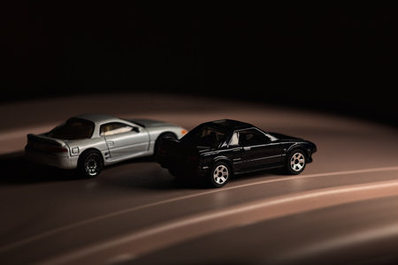 Mantua, Italy - 9TH DECEMBER 2025 - Replicas of a white Mitsubishi 3000GT and a black Toyota MR2 on a toy pretending to have a race on a mountain pass