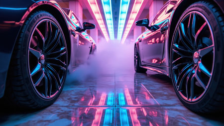 Two black cars with shiny wheels and vapor in a neon-lit tunnel. Pink and blue lights reflect on the floor.