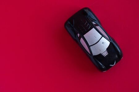 Photo of a toy car on a red background close-up.