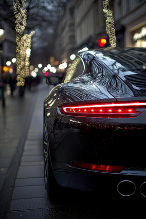 A sleek black Porsche is parked on a wet, dark street at night, illuminated by streetlights and festive decorations.