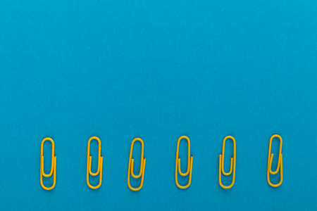Colored paper clips. Yellow paper clips macro close up isolated on a blue background with copy space.