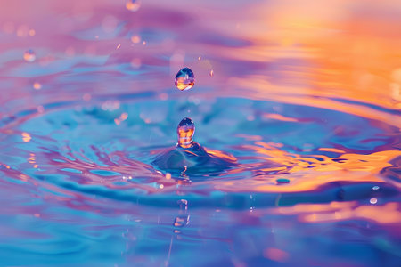 A single water droplet falls into a tranquil surface, sending out waves of ripples through a blend of orange and blue tones, creating a peaceful scene.
