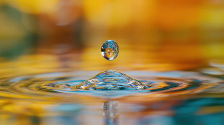 Captivating water drop suspended above the ripple, creating an interesting visual moment.