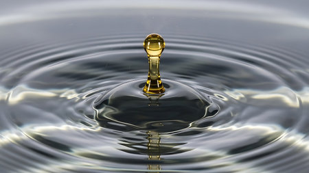Golden Drop of Essential Oil Creating Ripples in Clean Liquid Surface
