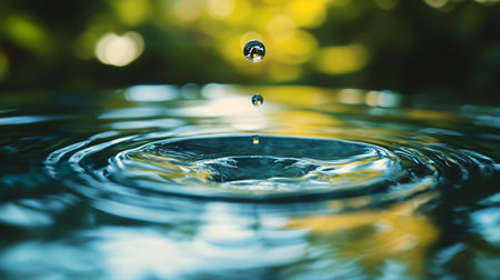 A close-up view of a water droplet falling onto a calm surface, creating mesmerizing ripples. The peaceful scene evokes a sense of tranquility and natural beauty.