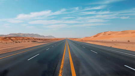 A striking desert road stretches towards the horizon, offering a sense of freedom and adventure. The clear blue sky contrasts beautifully with the golden sands.