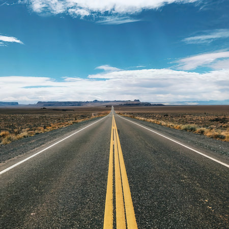 Desert straight road with yellow double lines